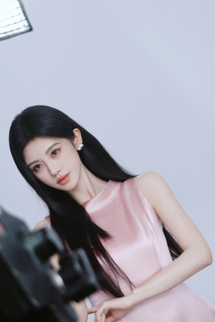 粉紫抹胸裙衬得她肩颈线条像精心雕琢的玉雕,蝴蝶胸针停在指尖,低马尾垂着同色系发带,柔化了眉眼的锋利,抬眼间又以清冷眼神将氛围感拉满。