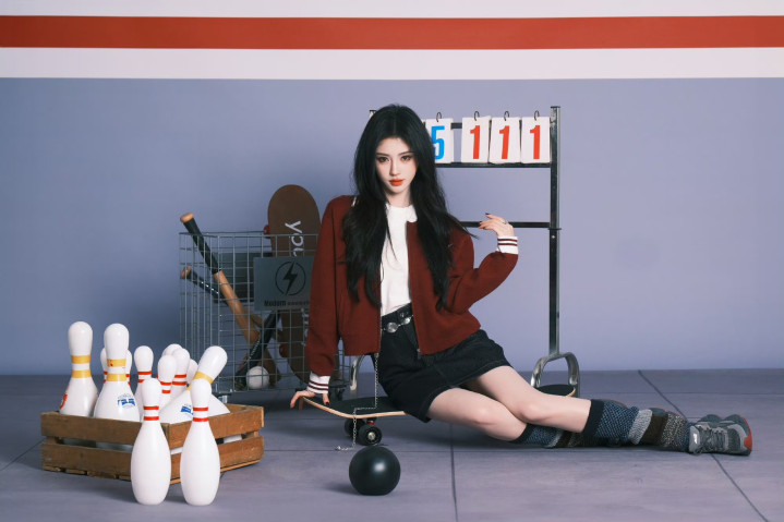 酒红开衫搭着牛仔短裙,黑板前的她像从青春剧里走出来的女主角。针织袖口的条纹、堆堆袜的复古感,把少年感揉进了眉眼间。
