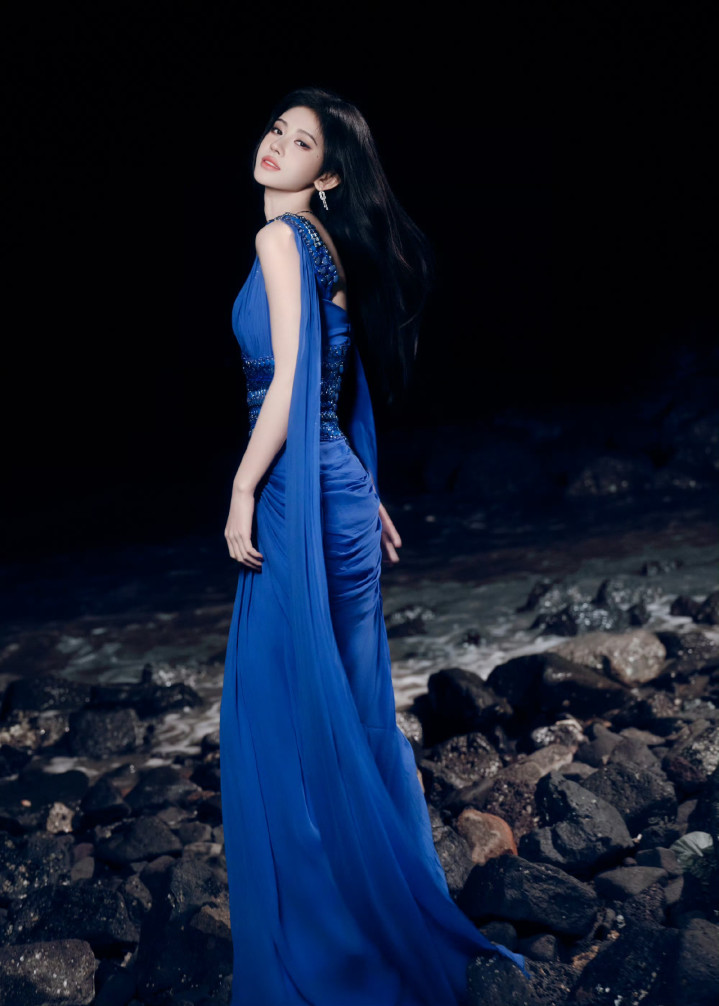 深海般的蓝裙轻裹身形,水色面料随动作轻扬,亮片与珠饰在暗处折射细碎光芒,宛如深海中游弋的鱼群。她垂眸时眼尾的弧度,比浪尖的月光更动人。
